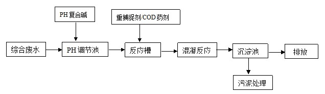 包含普通含銅廢水、酸堿廢水、處理后的油墨廢水等。污染物有銅、氨氮、COD等。與多數(shù)其他行業(yè)廢水類似,普遍采用化學(xué)法處理,采用藥劑主要有用到PH中和粉、重金屬捕捉劑、COD降解劑。重金屬捕捉劑和COD降解劑可根據(jù)殘余重金屬和COD的濃度添加,處理工藝流程如下: