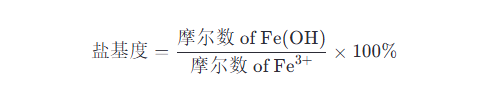 聚合硫酸鐵(Polyferric Sulfate, PFS)的鹽基度是衡量其結構和性能的重要指標。鹽基度是指聚合物中金屬離子與一定量反應物的化學計量比,通常表示為Fe(OH)與Fe3+的比例,反映聚合硫酸鐵中羥基(OH-)與鐵離子的摩爾比。鹽基度的計算公式可以簡化為: